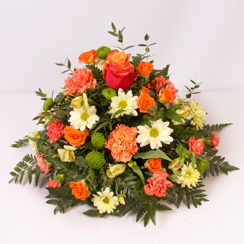 Classic posy in, oranges, creams and greens, including Roses, Carnations and Alstromeria.